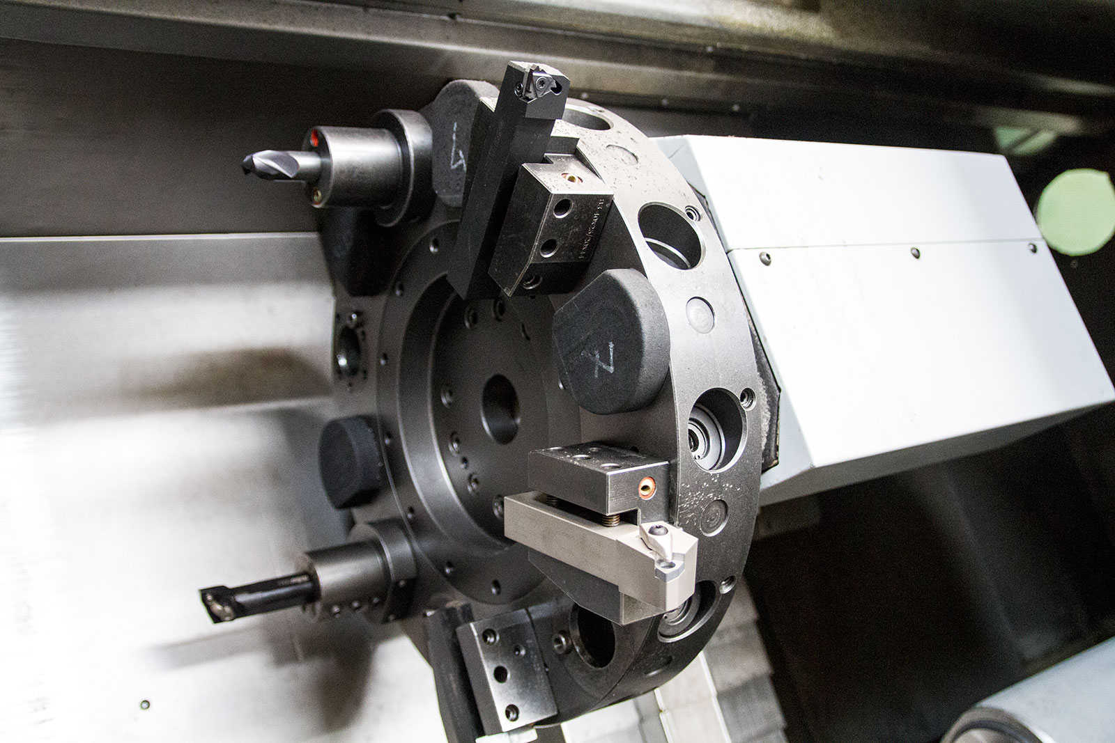 Particolare di una torretta porta utensili in grado di ospitare degli appositi utensili che possono svolgere lavorazioni di fresatura, foratura, maschiatura sul tornio stesso e senza ulteriori piazzamenti.
